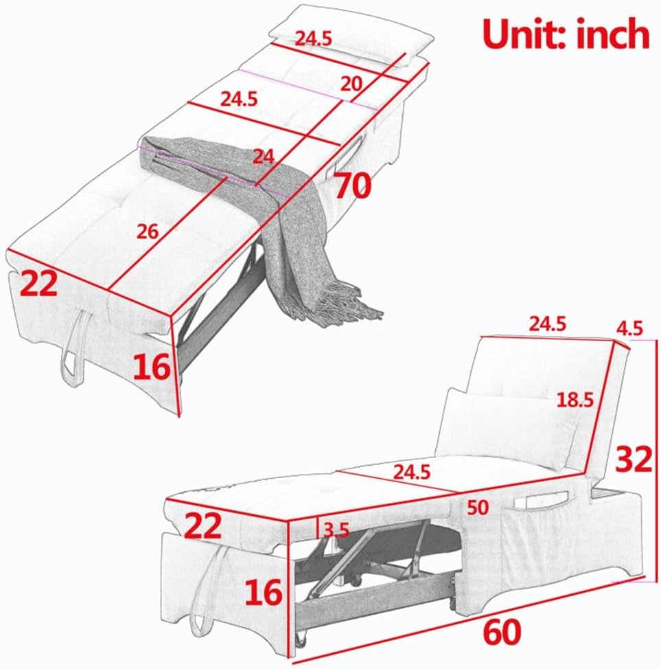 The trundle bed and adjustable backrest are designed to save space for you while having more options. The pulling point design of the sitting surface and backrest makes the sofa look more three-dimensional and full, and it can also be a multifunctional decoration.This product can meet your needs, it can be a sofa to sit on it for office or study, or a recliner to watch TV or play games or read on it, or a couch to rest and rest, or a temporary bed for uninvited guests at home.The faces of this sofa is made of soft foam, comfortable, and flexible. With the soft fabric, sit or lie on it and enjoy pures relaxation. It can also add to your home decor.two side design of two large-capacity storage bags, in this product to save space at the same time can also store some fragmented items or children's toys or put in two fashion magazines are a good choice.This product also comes with a soft lumbar pillow with consistent fabric, when you sit as a lumbar pillow, when you recline or sleep can be used as a headrest.Load capacity: 300 lbs/seatFrame material: solid wood + plywood + iron frameSeat structure: foamSize:As shownSet Includes1*Sofa Bed(no other presentation items included).Notice:1. Due to manual measurement, please allow 2-3% error, before you bid, please make sure you don't mind.2. The color may vary due to different displays, please refer to the actual product.