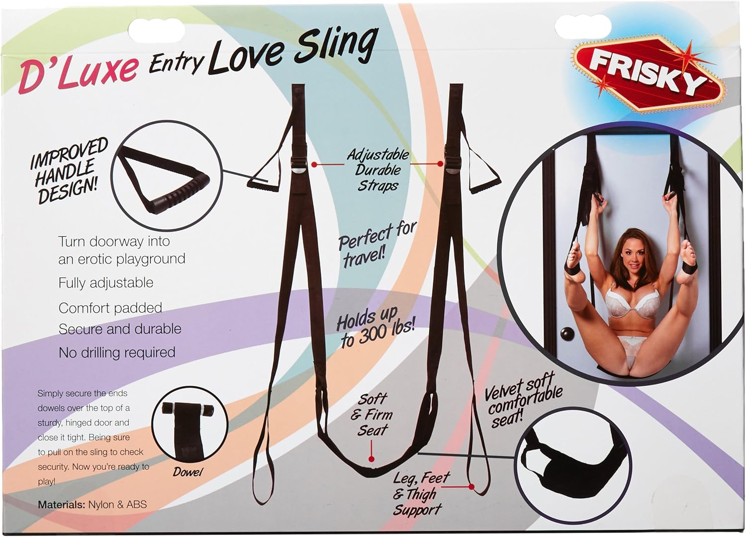 Now you can take sex play to a new level, anytime, anywhere! This premium sex sling provides comfort as well as security. With its padded seat, foot stirrups, and easy-grip handles for your hands to hold on to, you are sure to enjoy the comfort and flexibility this sling offers. Almost any doorway becomes an erotic playground when you secure the anchor dowels over the top of a sturdy, hinged door and close it tight. Made of heavy-duty nylon and fully adjustable tightening buckles as well as extra wide straps, this premium positioning aid is perfect for leverage at any angle. Material: Nylon, ABS, Color: Black, Note: Holds up to 300 pounds.