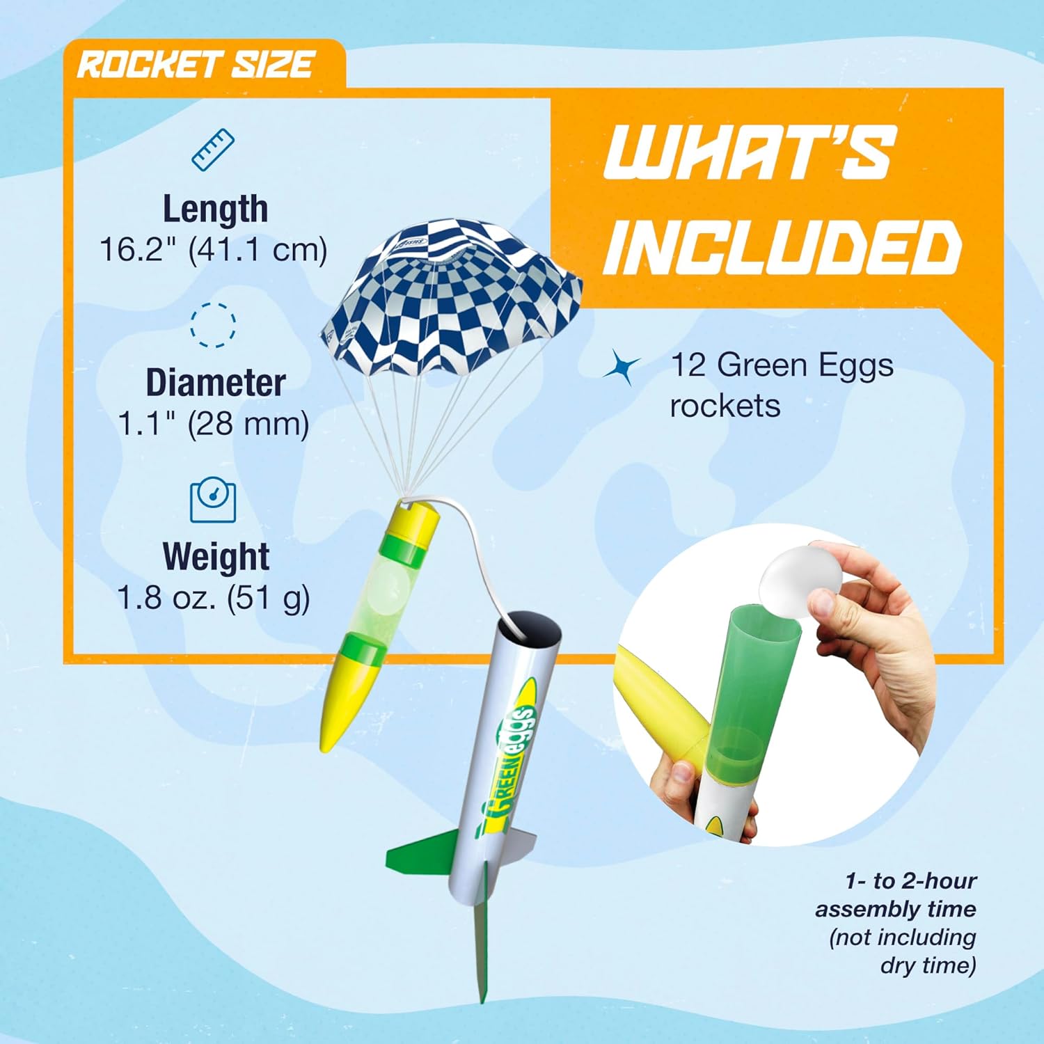 The Estes Green Eggs bulk pack sparks creativity and hands-on STEM learning through exciting payload rocketry. This set includes 12 Green Eggs model rocket kits, each featuring a clear payload section designed to carry a regular-sized raw egg for thrilling eggloft challenges. Each rocket has a projected altitude of up to 825 ft. with an egg and 1,050 ft. without an egg. The recommended rocket engines for launching with an egg are the C11-3 and D12-3 engines, and you can use the C11-5 or D12-5 engines if you wish to launch the model rocket without an egg payload. With a sturdy design and reliable recovery system, the Green Eggs rockets are perfect for demonstrating principles of aerodynamics, payload stability, and parachute recovery.Perfect for families, friends, hobbyists, or aspiring rocketeers, the Green Eggs bulk pack offers hands-on experience in physics, engineering, and aerospace. It is ideal for helping kids explore the wondrous world of science and develop a better understanding of how rockets reach outer space. After an estimated assembly time of 1–2 hours per model rocket (not including glue- and paint-drying time), these model rockets will be ready for proud display or launch prep.To build and launch each rocket, you will need scissors, a pencil, a ruler, fine sandpaper, carpenter’s glue, a hobby knife, masking tape, a compatible Estes model-rocket engine, Starters, Recovery Wadding, and any extra materials listed in the directions. Always follow the NAR (National Association of Rocketry) model-rocket safety code during operation.Estes rocket kits are built from the highest-quality components and designed around the unforgettable experience of pressing “launch.” Our hobby and STEM educational products range across all skill levels, interests, and power levels. Unleash the space dreamer and science enthusiast in you with an Estes model rocket!