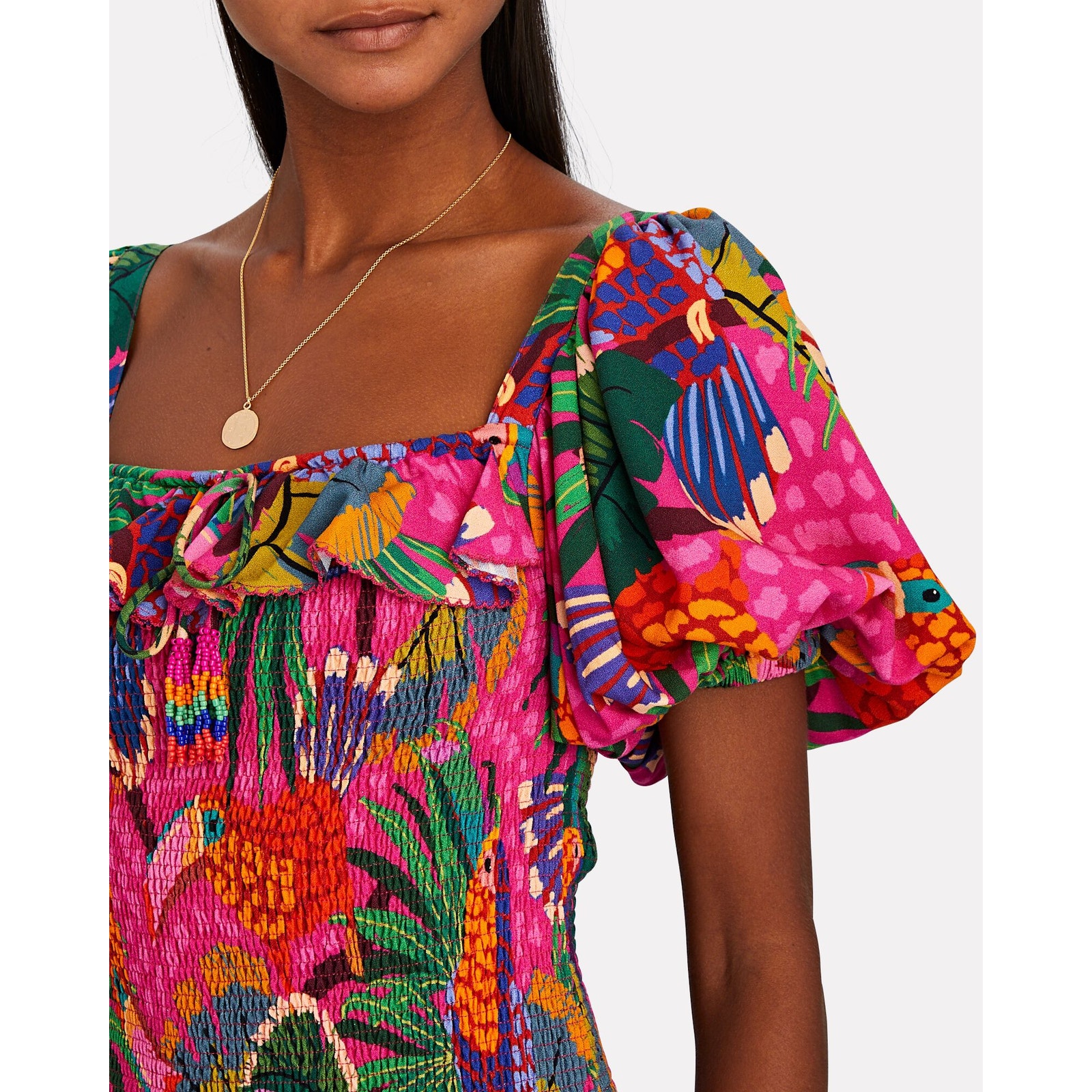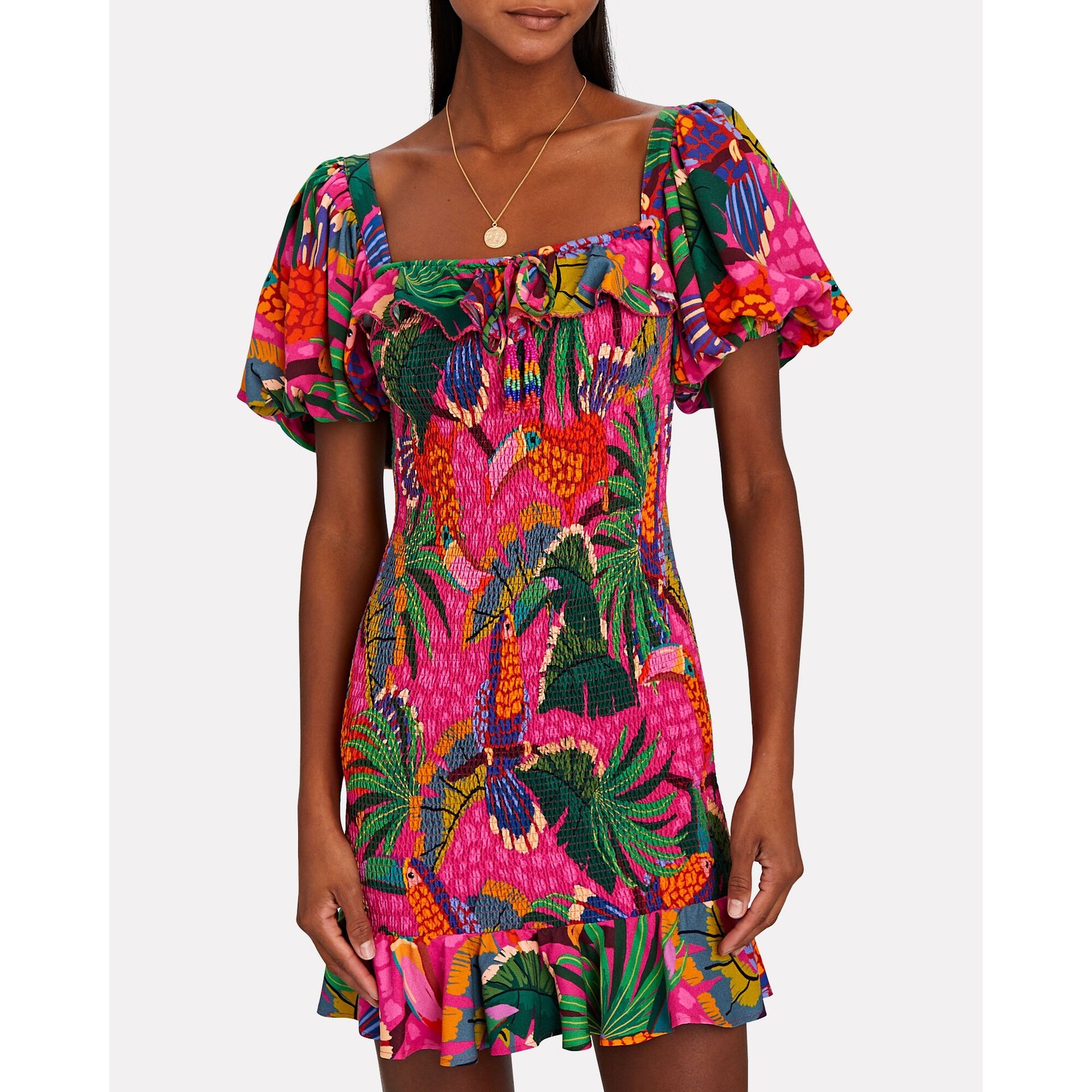 FARM RIO Small Painted Toucans Square-Neck Tropical Mini Dress Pink/Green