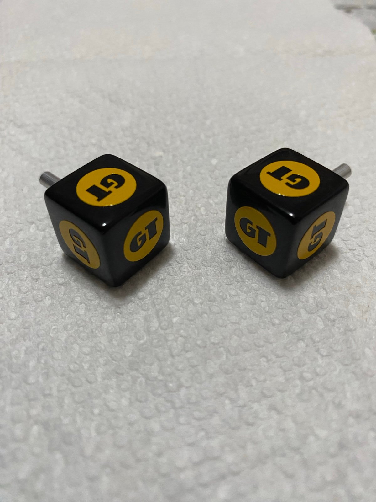 GT bmx combo black dice with gold coin GT logos, Custom made vintage style , Air valve caps and brake cable end caps , Valve caps they screw on with the regular air valve stem and the brake cable end caps they just need to be crimped into the end cable , check my other items for more combinations and colors also I make Dyno , redline, haro , hutch, skyway, mongoose, gt oldschool , SE bmx, Diamondback bmx, throne bmx, torker bmx , LA Dodgers, Raiders shield, huffy bmx, skyway TA bmx, Robinson bmx and gt newer style logos.