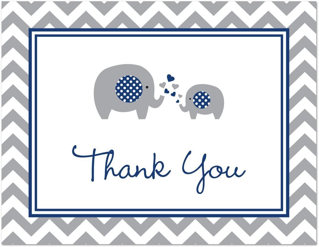 This cute thank you card features a gray elephant with a navy polka dot ear on a text frame over grey chevrons. These note cards are the perfect way to thank guests for sharing your special day with you.
