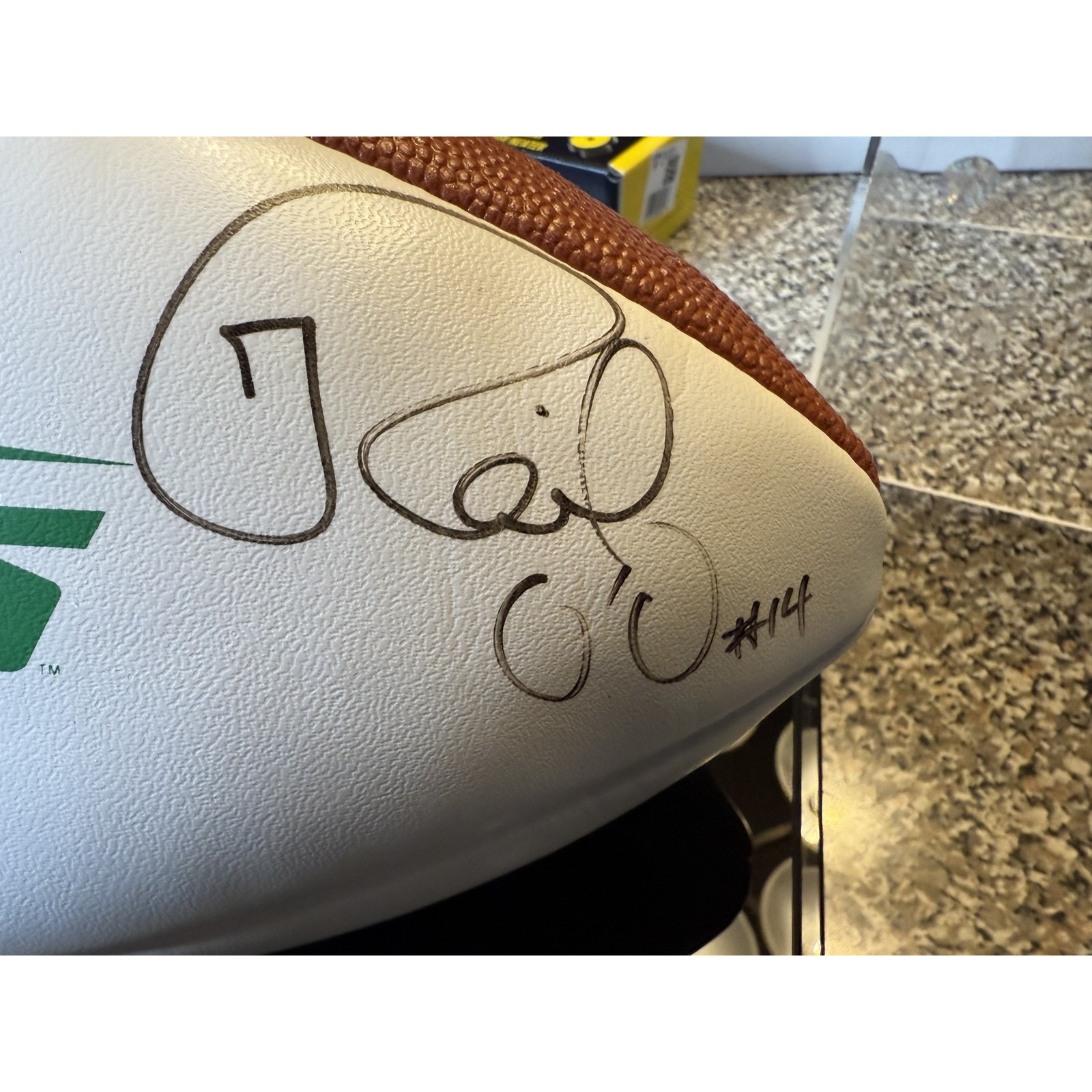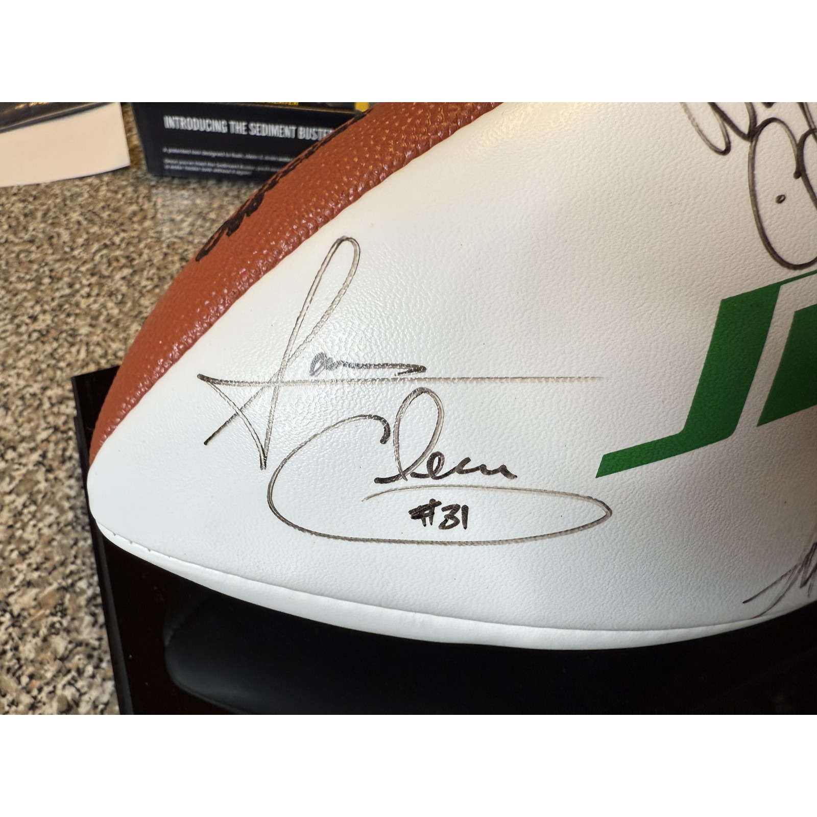 This official New York Jets white panel football features bold, clear signatures from Wayne Chrebet, Marvin Jones, Aaron Glenn, and Neil O'Donnell. The ball comes housed in a premium Jets-logo display case -- a must-have for any serious Jets collector.