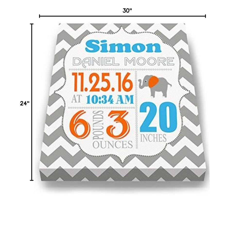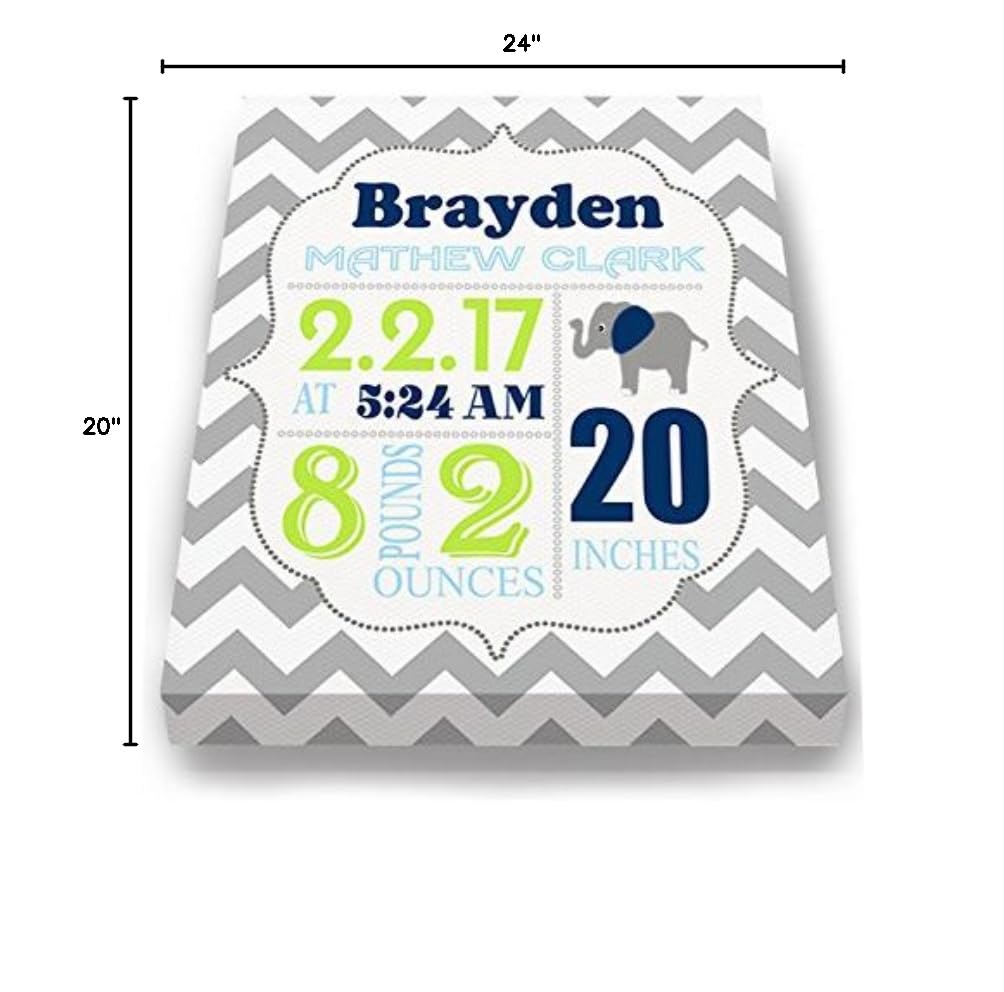 Celebrate your baby’s arrival with this personalized elephant-themed birth announcement canvas, a beautiful keepsake designed to capture every detail of your newborn’s special day. Featuring a soft and sweet elephant illustration, this canvas print includes your baby's name, birth date, time, weight, and length—custom printed to create a lasting memory you'll treasure for years to come. Perfect for decorating a nursery or giving as a heartfelt baby shower gift, this canvas is crafted with high-quality materials for a gallery-style look. Each piece is printed on durable poly-cotton canvas and stretched over a solid wood frame, ensuring it arrives ready to hang with no additional framing needed. Whether you’re welcoming your own child or gifting it to new parents, this charming birth announcement artwork brings warmth, joy, and a personal touch to any baby’s room. Key Features: Personalized with your baby’s birth stats Adorable elephant design in neutral tones High-quality canvas stretched over wood frame Fade-resistant inks for lasting beauty Ready to hang—no framing required