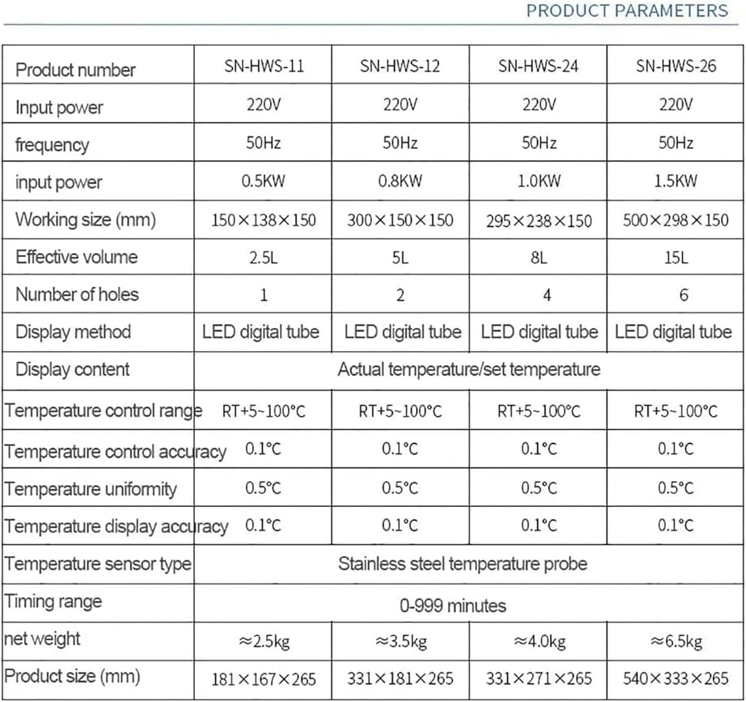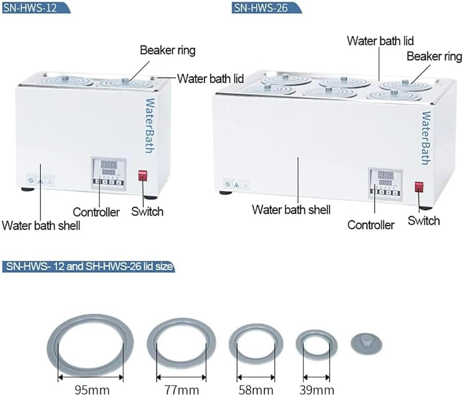 Model number:The thermostatic water bath is widely used in drying, distillation, concentration, immersion in chemical reagents, pharmaceutical and biological products, it can also be used to heat up constantly and other temperature tests, it is a biological, genetic and environmental protection medication., aquatic products, health sciences, biochemistry laboratory, education and scientific research tool.Adjustable in 0.1 ° C increases, the temperature can be adjusted accurately from the ambient temperature to 100 ° C and can be easily controlled with a built -in timer that goes from 0 - 999 minutes.The Dual Dual Dual Cover with a protective frame guarantees higher precision and performance that maintains the desired water temperature with a simple and easy to use functioning, avoiding damage caused by water overflow.A single hole, two holes and four holes., there are six holes available to choose to meet different experimental needs.Specification:Model: 1 hole, 2 holes, 4 holes, 6 holesTemperature range: RT +5 to 100 ° C,Temperature increase: 0.1 ° CPower: 500W, 800W, 100W, 1500WInner wall material: stainless steelEffective volume: 2.5l, 5l, 8l, 15lSynchronization function: YesDigital screen function: YesCOATING SIZE: 150x150x138 mm, 300x150x150 mm, 295x238x150 mm, 500x298x150 mmProduct size: 181x167x265 mm, 331x181x265 mm, 331x271x2 65 mm, 540 x 333 x 265 mmPackage content:1 x Digital Maria Bathroom1 x stainless steel lid1 x power cable1 x bearer1 x PP cover ring1 x manual