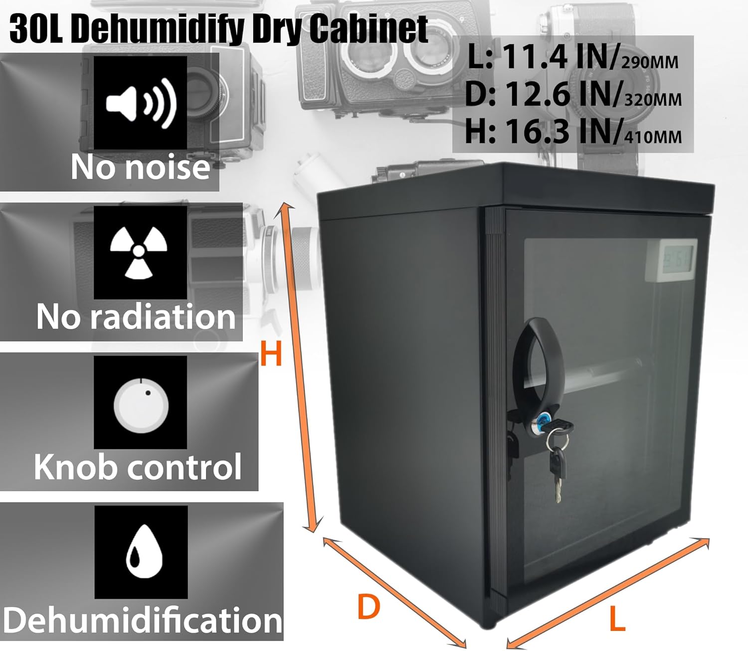 Features๐Camera lens dry cabinet 30l -Adopting the latest TE cooling chip design, it can quickly drive moisture and take effect within 1-3 hours -The humidity range is RH 25% -60% -No compression engine, no fan, no noise, no thermal effect. This cord adopts DC input, with low power consumption, energy saving, and no leakage risk -Prevent potential risks of high-pressure leakage or fire in stored items -Moisture-proof, rust-proof, deterioration-proof, dustproof, a lower cost storage method Be Careful -Do not place any corrosive, hazardous, volatile, or flammable materials inside; When storing food, drugs, or chemicals, please seal and store them separately to avoid leakage -Any odor and chemical vapor can contaminate other stored items and damage the drying machine -Do not disassemble the controller by yourself to avoid damage or danger -Please regularly check if the displayed humidity value (about 10 days) is within the ideal range. If not, please check the set value.๐บ๐ท๐ฌ๐ช๐ฐ๐ญ๐ฐ๐ช๐จ๐ป๐ฐ๐ถ๐ต๐บ: Volume: 30L Machine Material: cold-roll steel sheets/tempered glass door Size: 11.4ร12.5ร16.3in Control range of wet: 30%-60%RH Power: <8W Weight: 8.4kg/18.5lbs๐ท๐๐๐๐๐๐ ๐ช๐๐๐๐๐๐: 1 x Camera Dry Cabinet 30L